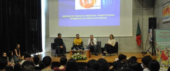 Foi neste contexto que, na tarde de sete de maio, se realizou, para um público de três turmas do 11ºano, uma ação de sensibilização para a importância da dádiva de sangue – “Bora lá! Dar sangue salva vidas – um valor socialmente reconhecido” – dinamizada pelo responsável pela gestão da dádiva de sangue do Serviço de Sangue e Medicina Transfusional dos HUC , Dr. Mário Gama, acompanhado pelo Dr. José Pedro Ferreira. A sua apresentação foi muito esclarecedora não só do ponto de vista do processo em si, mas também pela partilha de situações concretas, alguns casos-limite, que emocionam pelo encontro feliz entre a ciência e o altruísmo.